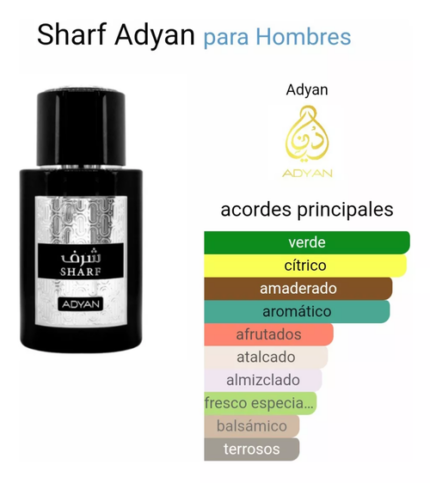 ADYAN SHARF Fragancia poderosa y refinada que ofrece una combinación única de notas amaderadas, florales y especiadas. Con una apertura