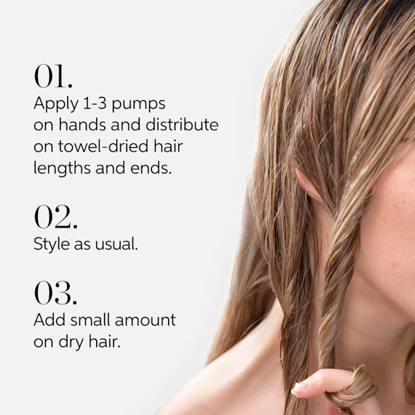- Para obtener mejores resultados, utilice el aceite como toque final después de secar o peinar su cabello.