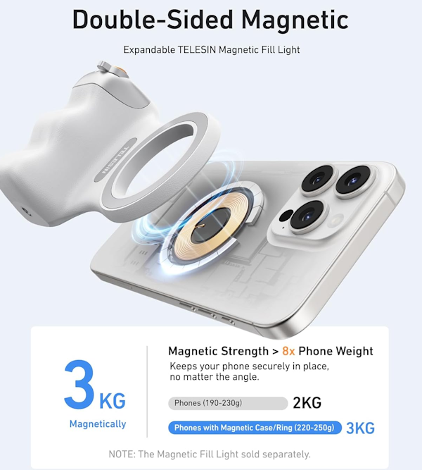 Compatible con la serie de luces magnéticas para selfies TELESIN y cuenta con un conector de rosca para trípode de 1/4″ para mayor flexibilidad al añadir soporte para trípode, micrófonos y más. Para una experiencia versátil y multifuncional. Perfecto para mejorar cada aspecto de la fotografía y videografía móvil.