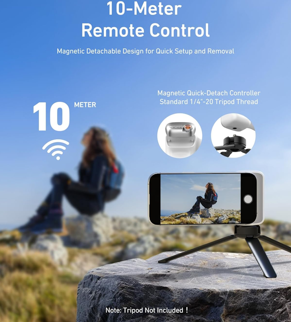 Equipado con un control remoto inalámbrico desmontable de 10 m/32,8 pies, compatible con sistemas iOS y Android, se integra perfectamente con la aplicación de cámara de tu teléfono mediante conexión Bluetooth. Conéctalo fácilmente a tu smartphone sin necesidad de descargar aplicaciones.