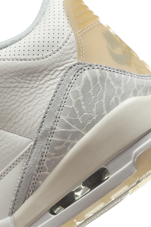 Regresa el AJ3, impecable y supremo. Esta edición sube de nivel las texturas con la combinación de un tono marfil suave como base, revestimientos de gamuza en color neblina gris y detalles traslúcidos en la presilla en el talón y la suela. Cuenta con dos logotipos en el talón y dos logotipos Jumpman en la lengüeta, porque tener dos veces el Jumpman lo hace dos veces fabuloso. Las Air Jordan 3 Retro SE Craft en color “Marfil” lucen una parte superior de cuero blanco con superposiciones de estampado de elefante gris en la puntera y el talón. Un Jumpman doblemente visible decora la lengüeta, mientras que la pestaña semitranslúcida del talón luce la marca Jumpman tonal sobre un logotipo de Nike estampado. Esta silueta retro se asienta sobre una entresuela de poliuretano blanca a juego, con amortiguación Air-Sole visible y un sutil toque de color crema en el talón. La suela exterior de goma translúcida proporciona una tracción duradera.