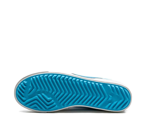 Estas Blazer de corte medio cambian su habitual base de cuero blanco por una parte superior completamente negra. La puntera es de ante a juego con los cordones y el cuello de tejido acanalado. El llamativo color aguamarina brillante se presenta en forma de grandes Swooshes conectados en los laterales y medial de la zapatilla, y en las costuras en zigzag expuestas que recubren la puntera. La lengüeta y el logo Nike en la plantilla negra también son del mismo tono. Una entresuela texturizada en color vela y una suela exterior de goma aguamarina completan el diseño de estas zapatillas.