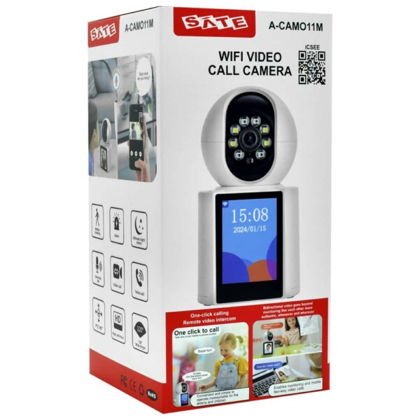 La Satellite A-CAM011M es una cámara de seguridad para interiores con monitor integrado, diseñada para la vigilancia del hogar o la oficina. Ofrece funciones adicionales como monitor integrado, videollamadas, audio bidireccional, detección de movimiento y visión nocturna, todo ello con acceso remoto a través del teléfono móvil.