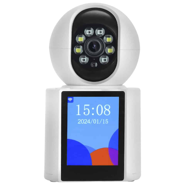 | Funciones | Incluye pantalla integrada, micrófono y altavoz integrados, visión nocturna infrarroja, detección de movimiento, permite realizar videollamadas directamente desde la cámara, ángulo de visión horizontal de 355° y vertical de 75°, y es compatible con la aplicación. |