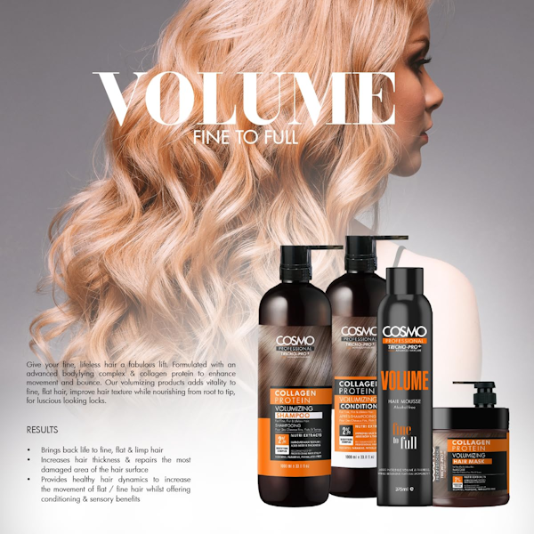 Dale a tu cabello fino y sin vida un realce fabuloso. Formulado con un complejo corporal avanzado y proteína de colágeno para mejorar el movimiento y elasticidad. Nuestros productos voluminizadores aportan vitalidad al cabello fino y liso, mejora la textura del cabello mientras lo nutre desde la raíz hasta las puntas.