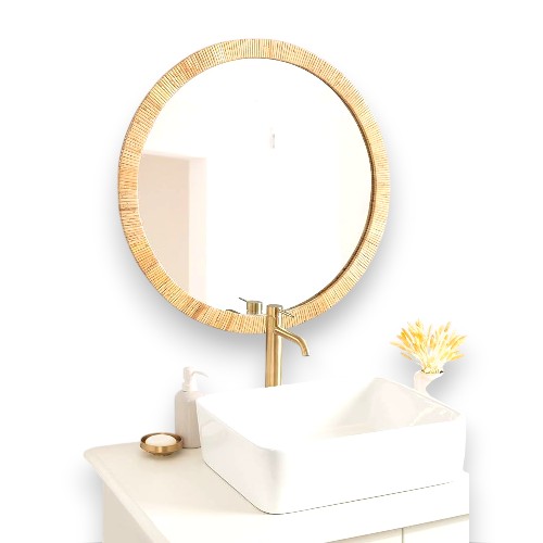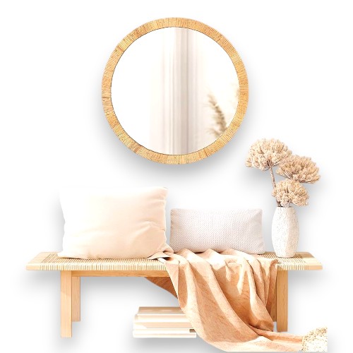 Este espejo redondo con marco de ratán tejido a mano es una pieza decorativa que aporta equilibrio, calidez y estilo a cualquier ambiente. Su diseño circular evoca armonía y suavidad visual, mientras que el material natural del marco ofrece un toque rústico y artesanal que se adapta fácilmente a estilos boho, mediterráneo, escandinavo o tropical.