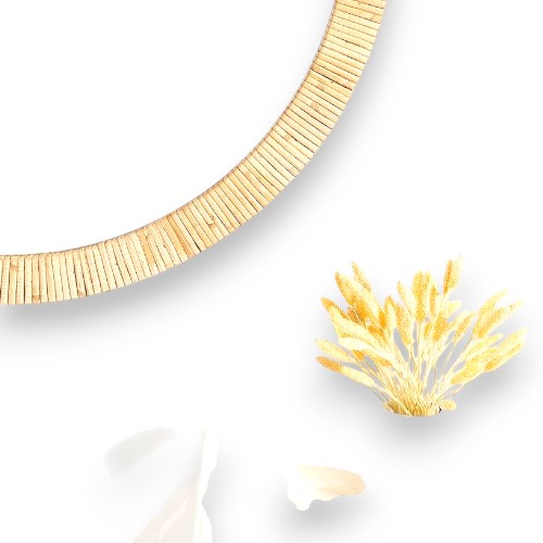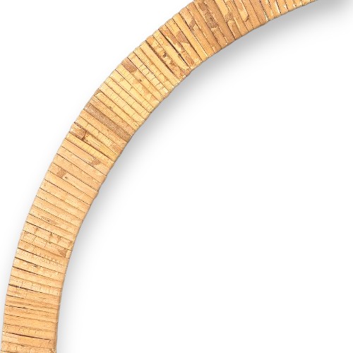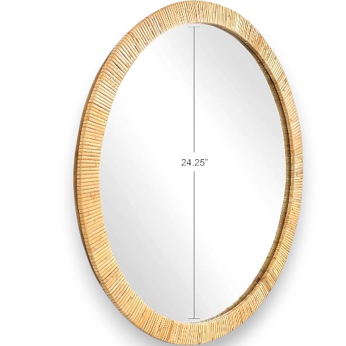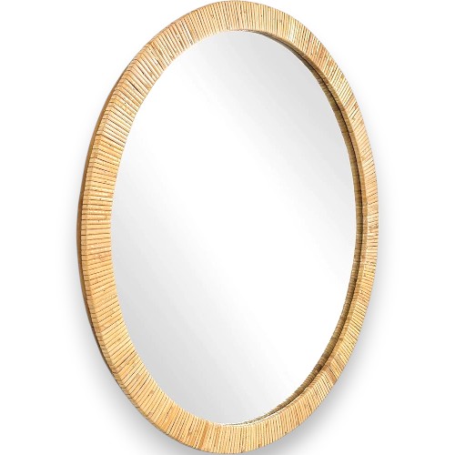 El marco está elaborado con fibras de ratán natural, cuidadosamente dispuestas para resaltar su textura orgánica y acabado cálido. Cada espejo es único, gracias a su fabricación artesanal, lo que lo convierte en mucho más que un objeto funcional: es una declaración de gusto y conexión con lo natural.