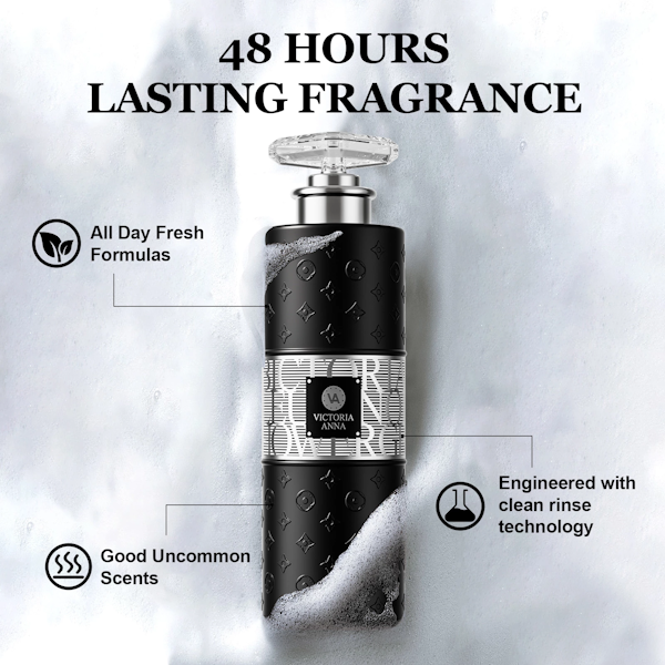 Gel de ducha hidratante y limpiador con fragancia Victoria Anna, fragancia que dura 48 horas.