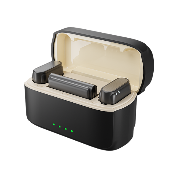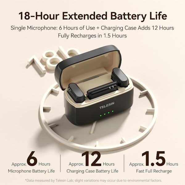 Disfruta de hasta 18 horas de uso prolongado. Cada micrófono dura hasta 6 horas con una sola carga, mientras que la funda completamente cargada añade 12 horas adicionales de tiempo de funcionamiento. La funda de carga se recarga completamente en solo 1.5 horas, manteniéndote encendido y listo para usar