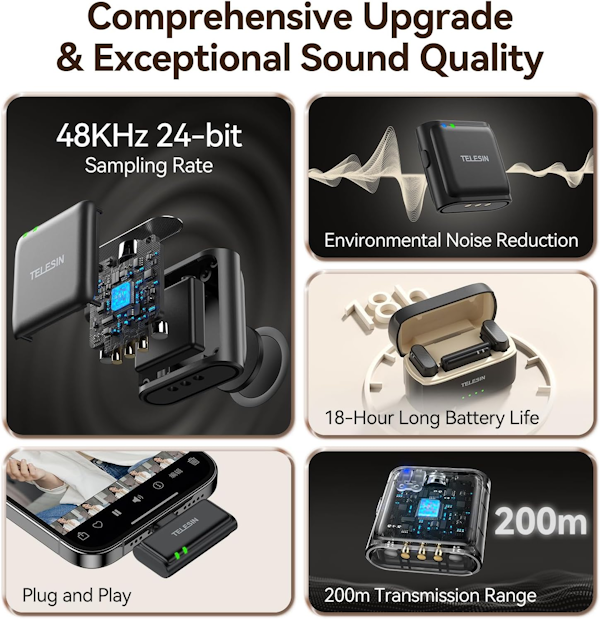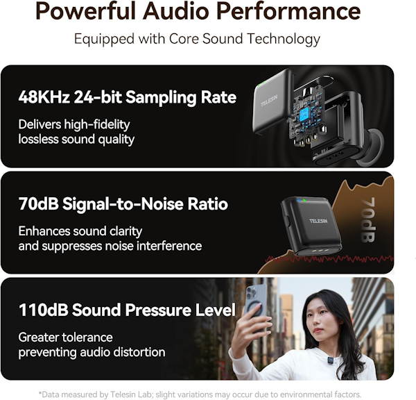 El micrófono inalámbrico con clip TELESIN cuenta con una frecuencia de muestreo de 24 bits de 48 KHz y cancelación de ruido de un solo toque. Con una relación señal/ruido de 70 dB, mejora la pureza del sonido al reducir las interferencias, mientras que su nivel de presión acústica de 110 dB garantiza una tolerancia excepcional para audio sin distorsiones, incluso a grandes volúmenes