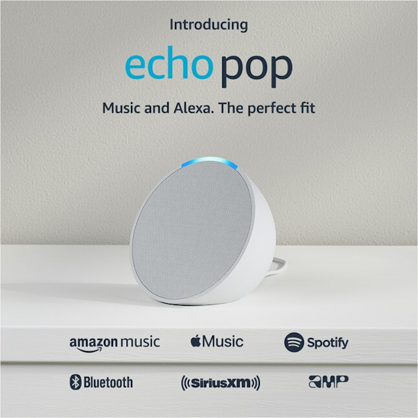 – Pídele a Alexa que ponga música, audiolibros y pódcast en tus proveedores favoritos como Amazon Music, Apple Music, Spotify, Pandora, Sirius XM y más. Conecta el Echo Pop por Bluetooth para reproducir contenido.