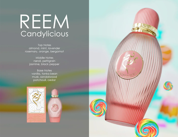 Reem Candylicious fusiona la nostalgia de las tiendas de dulces con la sofisticación moderna. Su frescura mentolada y cítrica le da un toque vibrante, mientras que su base cremosa de vainilla y madera deja una impresión atractiva y duradera: prueba de que una fragancia divertida también puede ser elegante.