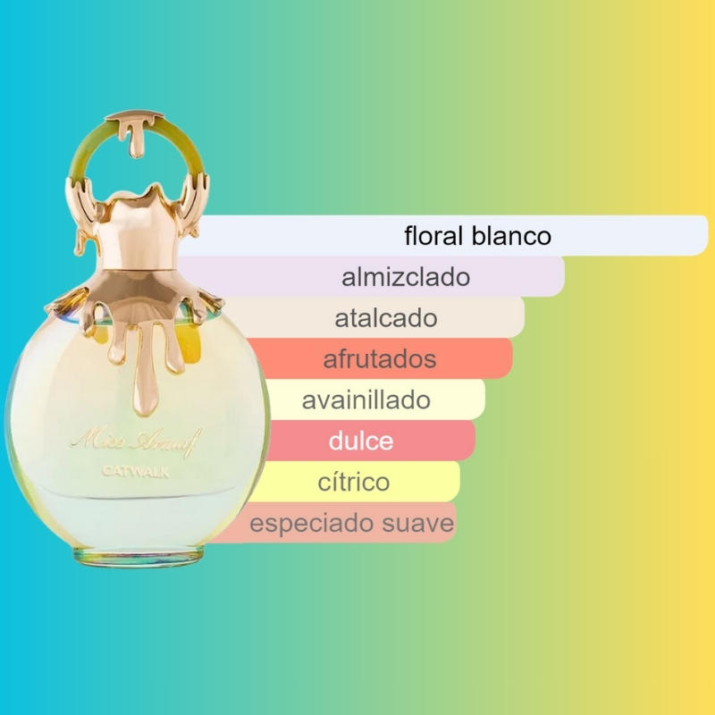 Miss Catwalk de Armaf es una fragancia femenina, conocida por su combinación dulce y afrutada con un toque moderno y juvenil. Se caracteriza por ser vibrante y ligera, ideal para el uso diario o en climas cálidos.