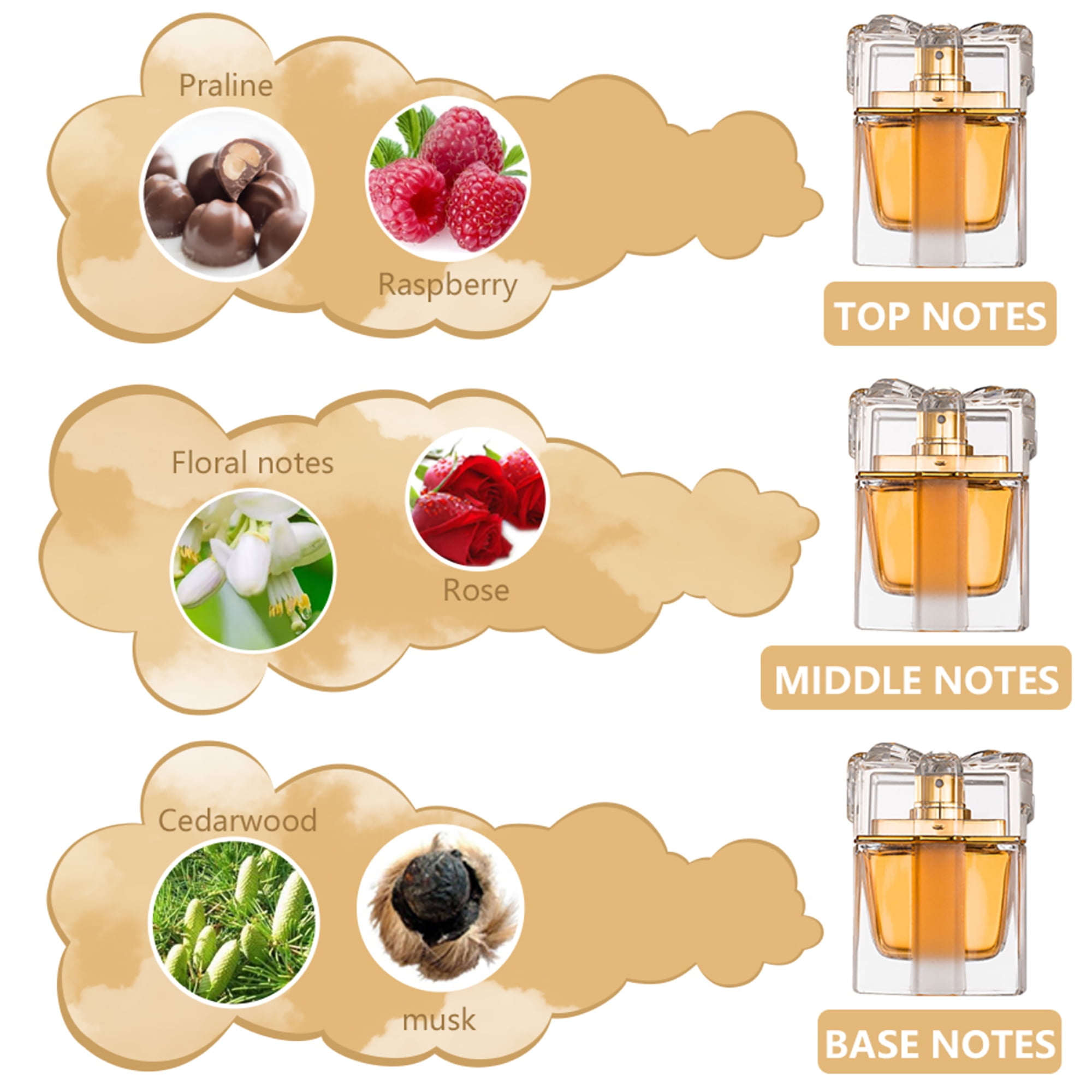 Notas de salida: naranja, pomelo, maracuyá, pera, aldehídos, praliné, frambuesa.