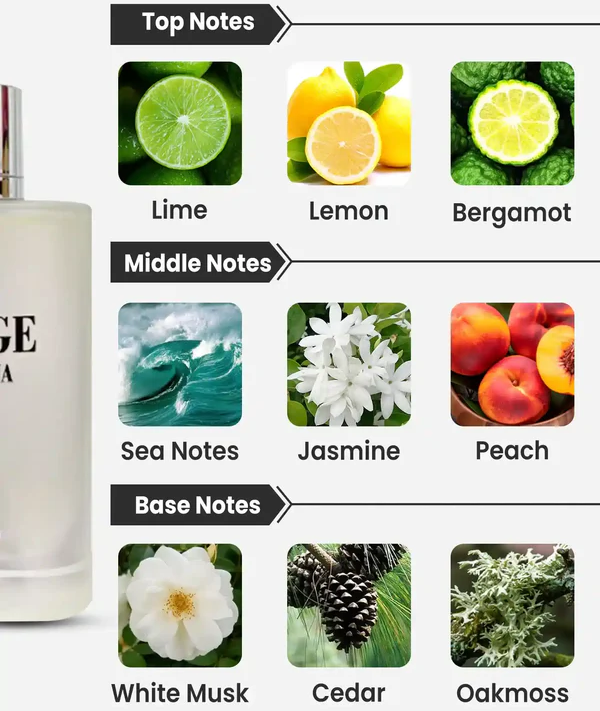Notas de Salida: lima, limón, neroli, mandarina, naranja, bergamota y jazmín.