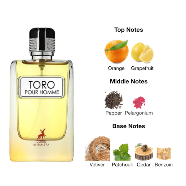Es una fragancia masculina con carácter, que crea una armonía perfecta entre notas especiadas, dulces y amaderadas. Este perfume está diseñado para el hombre moderno y seguro de sí mismo que busca un aroma potente y sofisticado. Experimenta el encanto de la masculinidad con Toro Pour Homme, una fragancia amaderada que combina cítricos, especias y notas terrosas para crear un aroma cautivador.