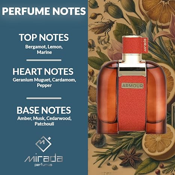 Es una cautivadora mezcla de notas refrescantes y especiadas, diseñada para evocar confianza y sofisticación. Elaborado como un perfume, cada pulverización te envuelve en su abrazo encantador, garantizando un aroma que cautiva a quienes te rodean. Las notas de salida de bergamota , limón y notas marinas crean una salida fresca y nítida, mientras que el corazón introduce calidez y especias con geranio , muguete , cardamomo y pimienta . Finalmente, las notas de fondo de ámbar , almizcle , madera de cedro y pachulí proporcionan una base rica y terrosa, convirtiendo a Armour en una fragancia audaz y duradera que deja una huella imborrable. Esta composición única la convierte en la fragancia perfecta para el hombre seguro de sí mismo, listo para afrontar cualquier reto.