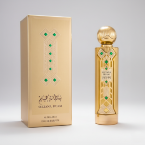 Envasado en una alta botella estriada de oro adornada con intrincados patrones de celosía y acentos de piedras preciosas verdes, Sultana Huam revela una composición gourmand, el perfume se siente rico, potente y envolvente, ideal si te gustan fragancias que dejen huella sonora (buena estela) sin ser excesivamente dulces.
