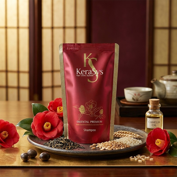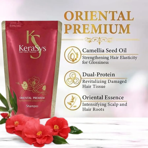 La línea Kerasys Oriental Premium es adecuada para todo tipo de cabello. Formulada con ingredientes especiales como extractos de proteína de trigo hidrolizada, que ayudan a fortalecer y facilitar el peinado, revitalizando el tejido capilar dañado; aceite de camelia, que ayuda con una hidratación profunda, restaurando la vitalidad del cabello; queratina, que aporta brillo y luminosidad al cabello; y esencia oriental, que hidrata profundamente el cabello. Es una línea que combate la porosidad y ayuda a restaurar el brillo, la suavidad y la fuerza del cabello.