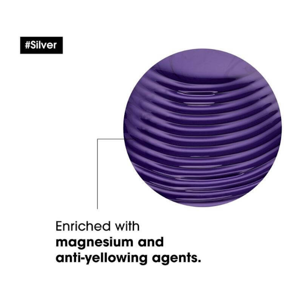 El champú plateado utiliza un enfoque de doble acción que combina tintes violetas con magnesio para un cuidado integral: