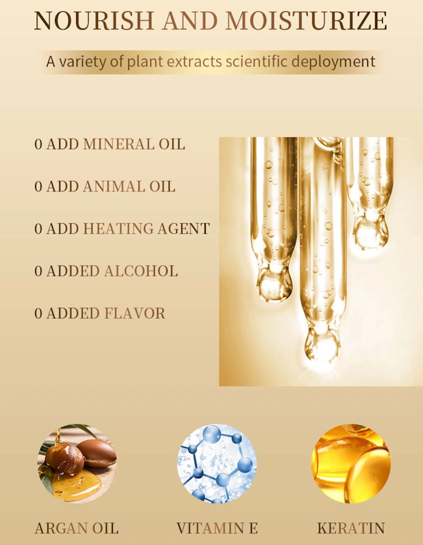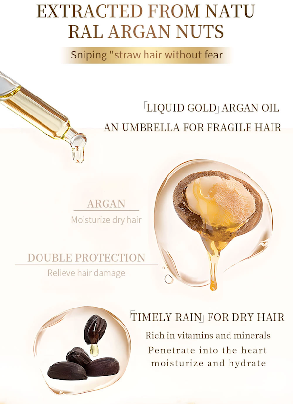Fórmula liviana, a base de aceites naturales: contiene 100 % aceite de argán marroquí, rico en vitamina E, ácidos grasos y antioxidantes. Penetra sin apelmazar el cabello y ayuda a reparar and estructuras dañadas.