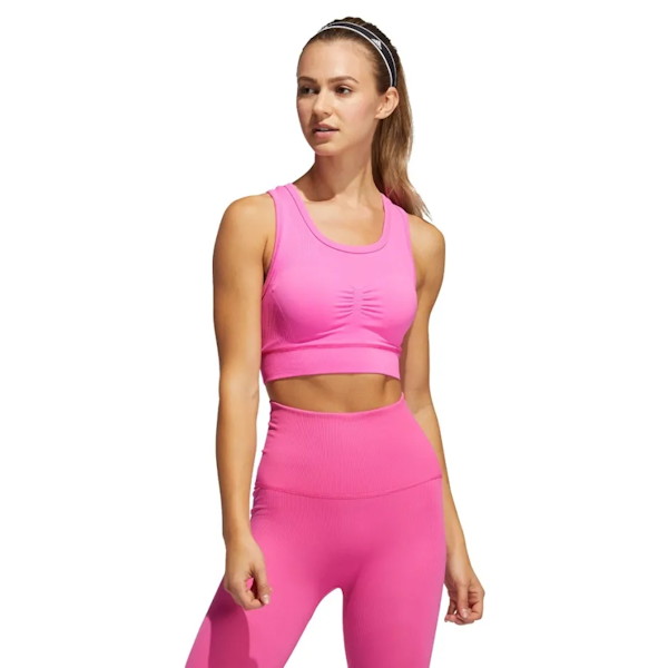 Un diseño a la medida de las mejores atletas. Este top deportivo adidas de soporte medio levanta, esculpe y realza tu busto sin restringir la libertad de movimiento. Úsalo para tu clase de baile, yoga o barre. El tejido sin costuras se siente muy suave contra la piel. Además, te brinda sujeción en las zonas donde más lo necesitas para que puedas rendir al máximo en todas tus actividades. Este producto está hecho con Primegreen, una serie de materiales reciclados de alto desempeño.