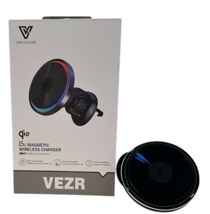 VH02 El cargador para auto Vezr Magnetic Wireless Charger 15W con iluminación RGB es un dispositivo innovador que combina carga