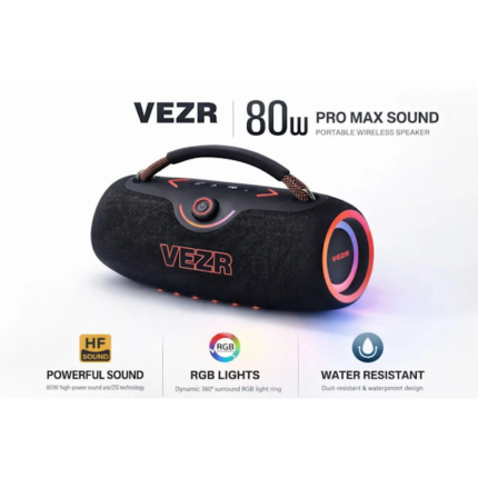 PRO MAX SOUND El altavoz Bluetooth portátil VEZR RGB de 80 W fue desarrollado para quienes buscan potencia real, sonido